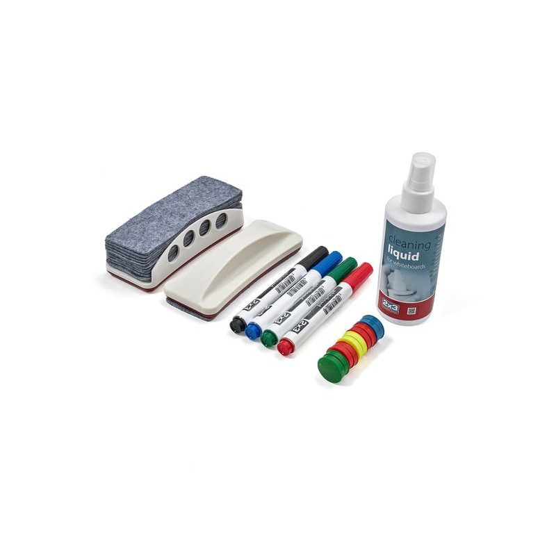 Startsæt med whiteboard-tilbehør. Indeholder whiteboardpenne, rengøringsspray, tavlevisker, penneholder og magneter.
